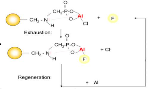 4、樹脂吸附飽和后,采用一定濃度的鋁鹽對樹脂進行再生洗脫,樹脂即可重新發(fā)揮吸附氟離子的目的。